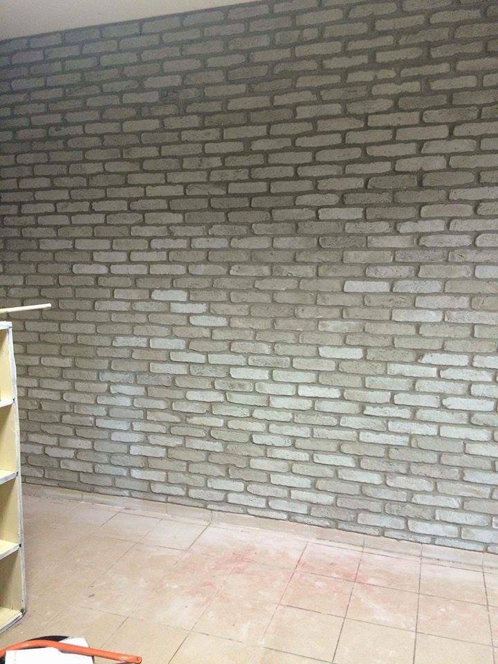 Az egyik falat téglával tüntettük el, de hagytuk szürkén, és ha már unalmas lesz, lefestjük fehérre.